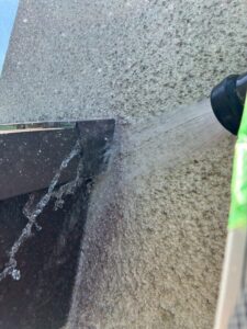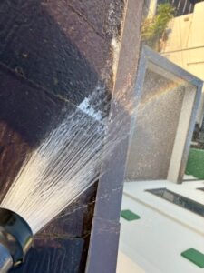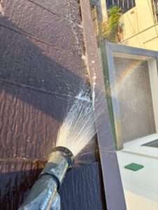 下屋根の側面部分、袖板金とよばれる部分ですが、風の強い日に雨漏りが発生するとのことでしたので、こちらから雨が吹き付けると想定して、散水させていただきました。