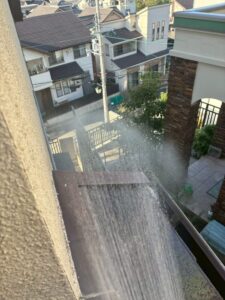 雨だけでは発生せず、風が強い日に発生するとのことで、散水検査をおこないました。
