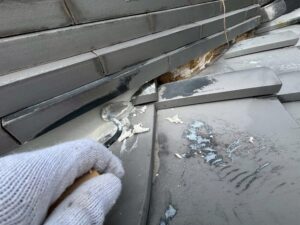 劣化した漆喰は密着力も弱っているため、これを残したままずさんな詰め直しを行うと、せっかく新しい漆喰が密着力に優れていても、葺き土・瓦との間で障害となってはがれやすくなるのです。