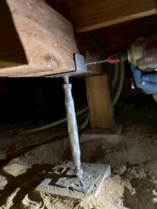 新しい束石を置き、束柱として木よりも頑丈な鋼製束を束石の上に設置しました。